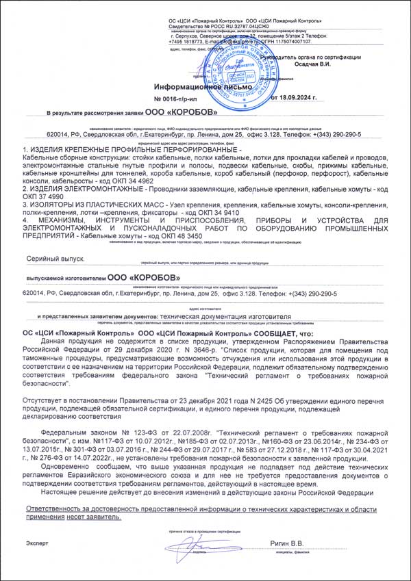 При запуске в производство, кабеленесущие системы проходят процедуру испытаний, добровольной сертификации и имеют пакет сертификатов, подтверждающий их полное соответствие государственным стандартам качества.